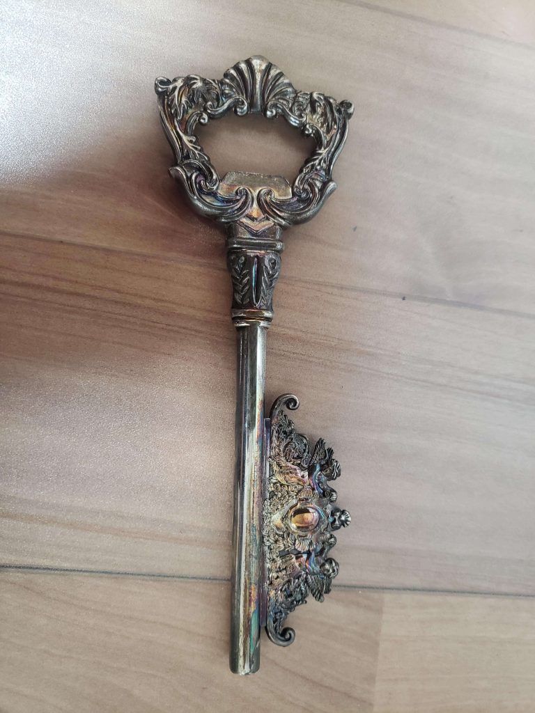 キラキラの、神様が持っているつえ???の形をした栓抜きです。